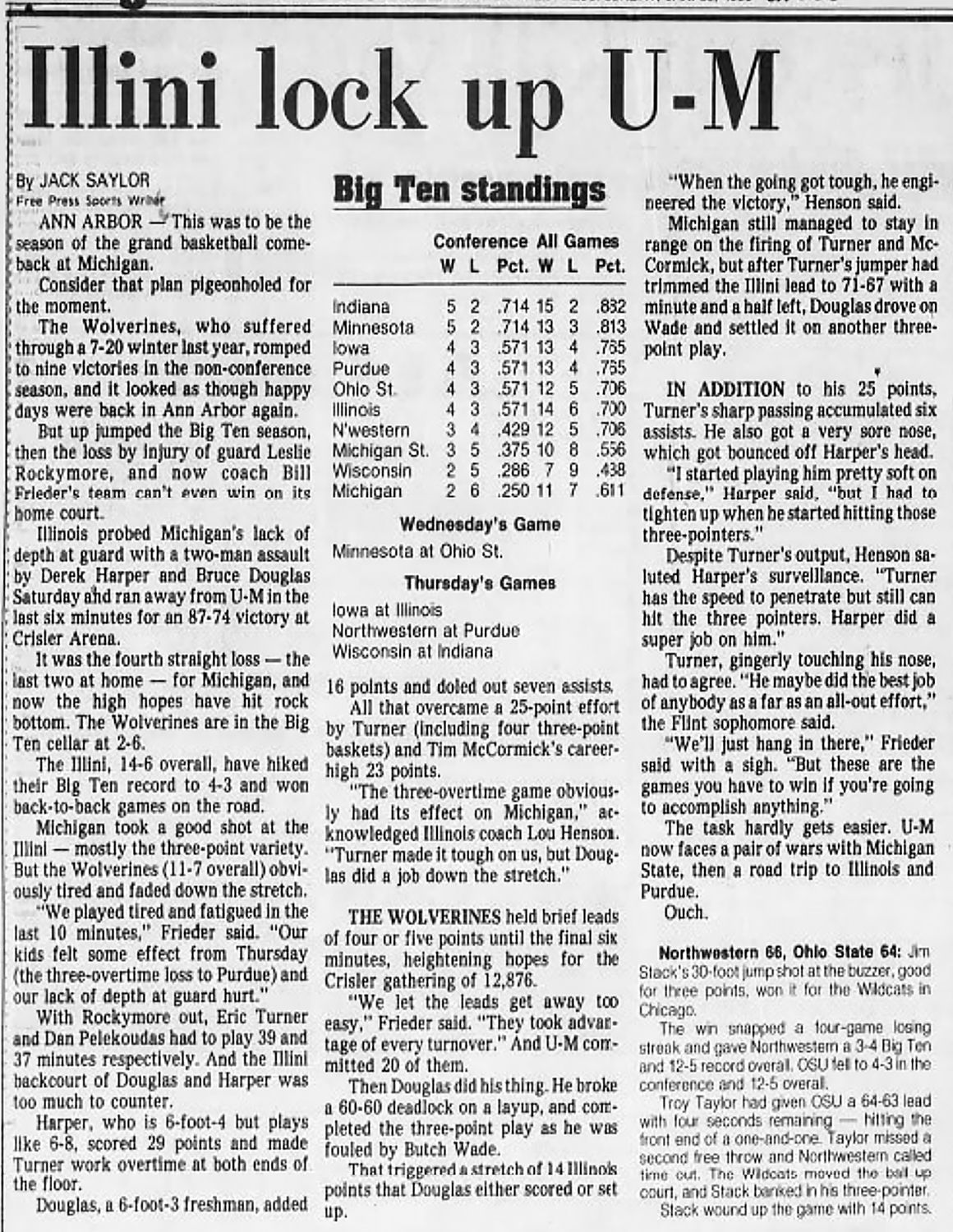 Jan. 29, 1983: Behind a career-high 29 points from Derek Harper, Illinois defeated Michigan at Crisler Arena, 87-74. It was Lou Henson's first coaching win in Ann Arbor in eight tries.