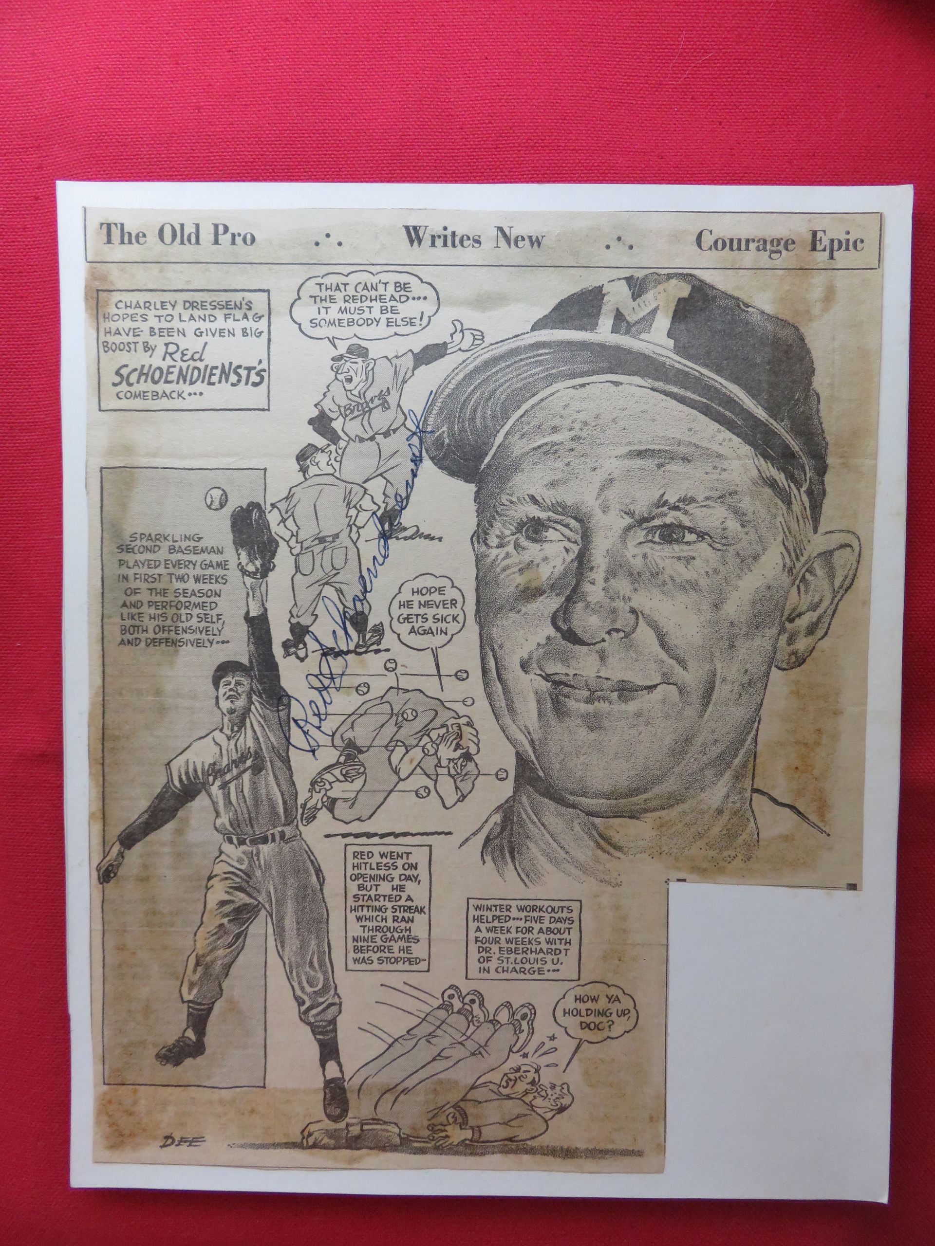 Red Schoendienst signed ("Red Schoendienst") Sporting News clipping from the 1950s AND HOF plaque card