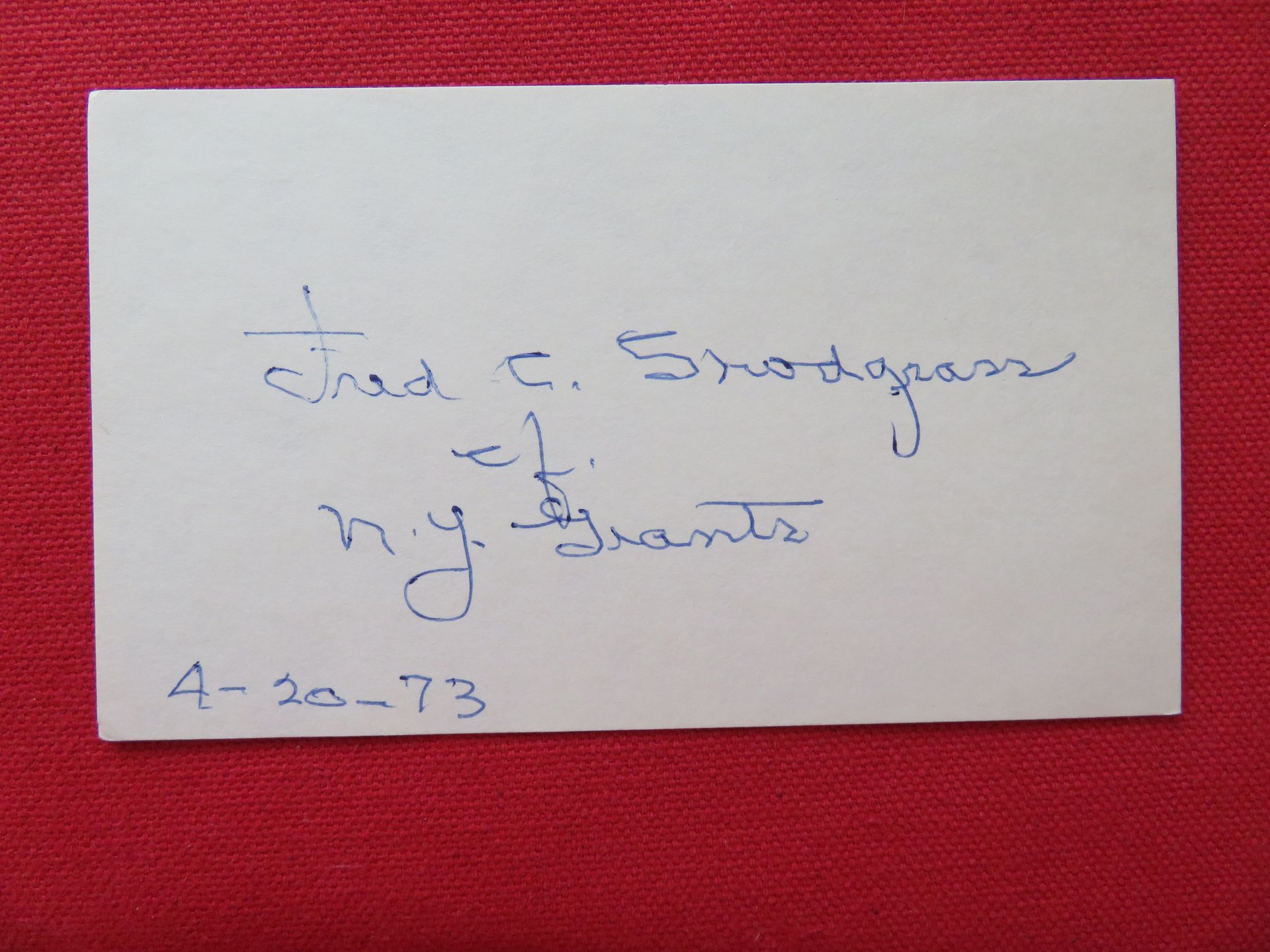 Signed "Fred C. Snodgrass of New York Giants 4-20-73"