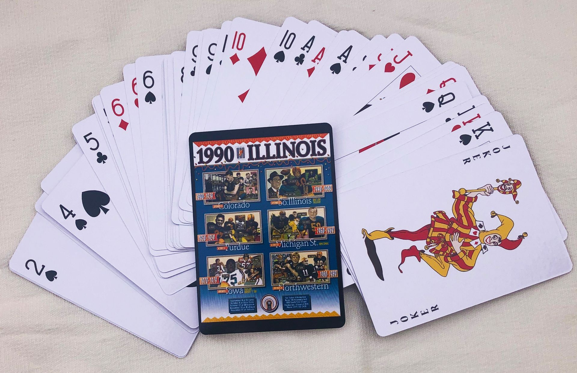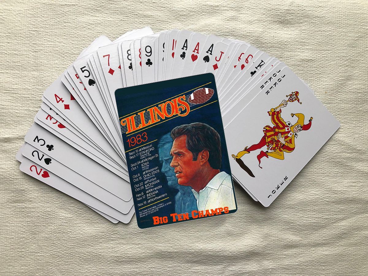 This unique deck of cards, featuring the 1990 Illini football poster, includes 52 standard cards and two Jokers and comes with a protective case.