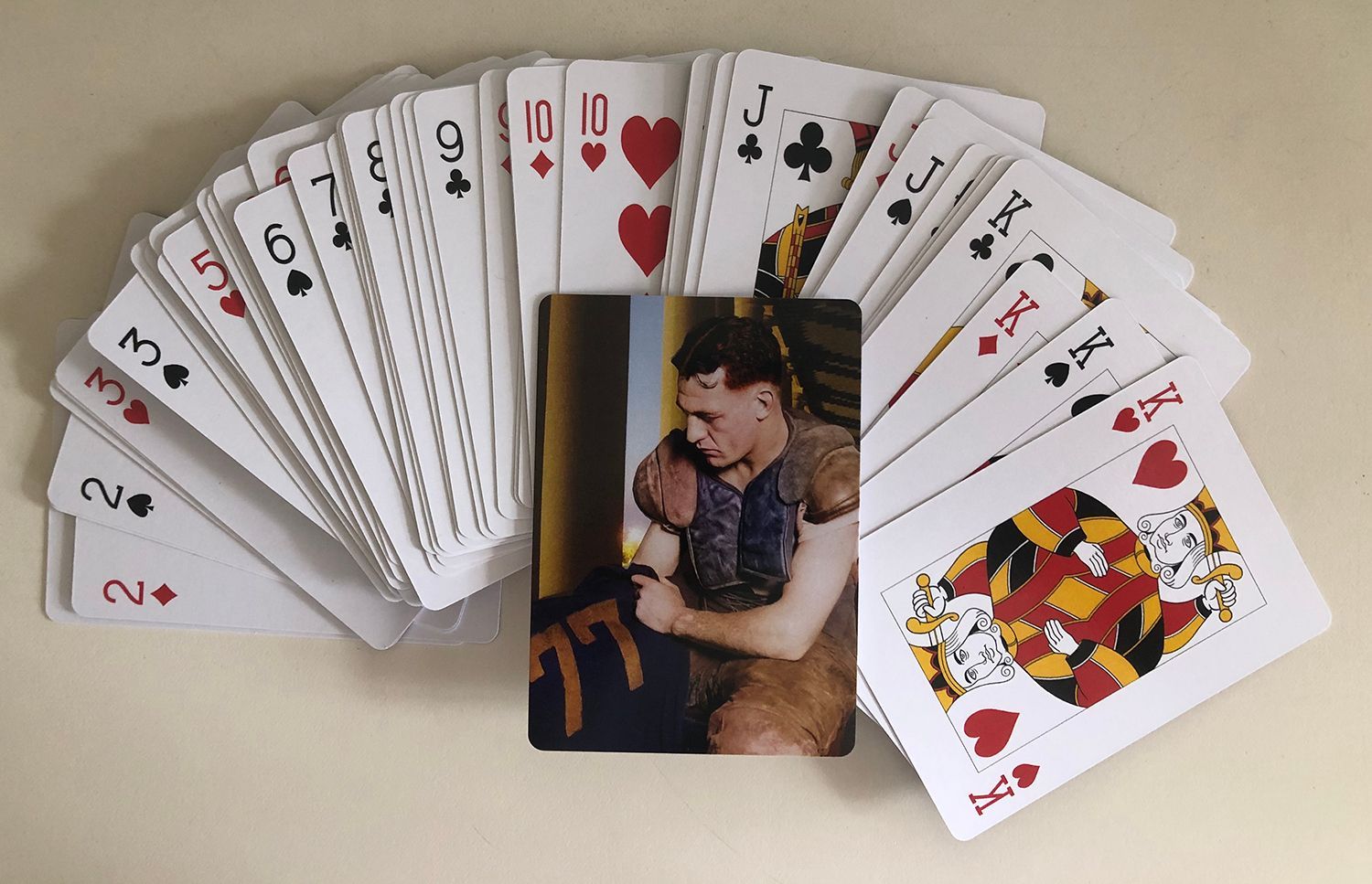 This unique deck of cards, featuring the color image of Red Grange, includes 52 standard cards and two Jokers and comes with a protective case.