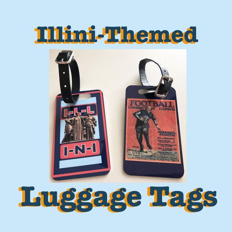 These unique Illini-themed luggage tags measure 2.25" x 2.25". On the backside, we can include text that has your phone number, address, or whatever you want.