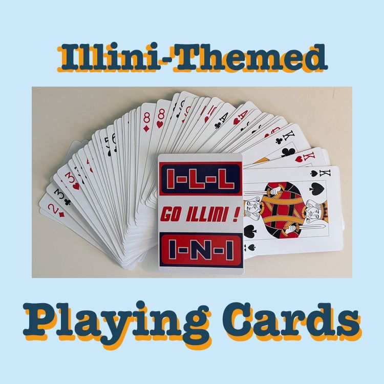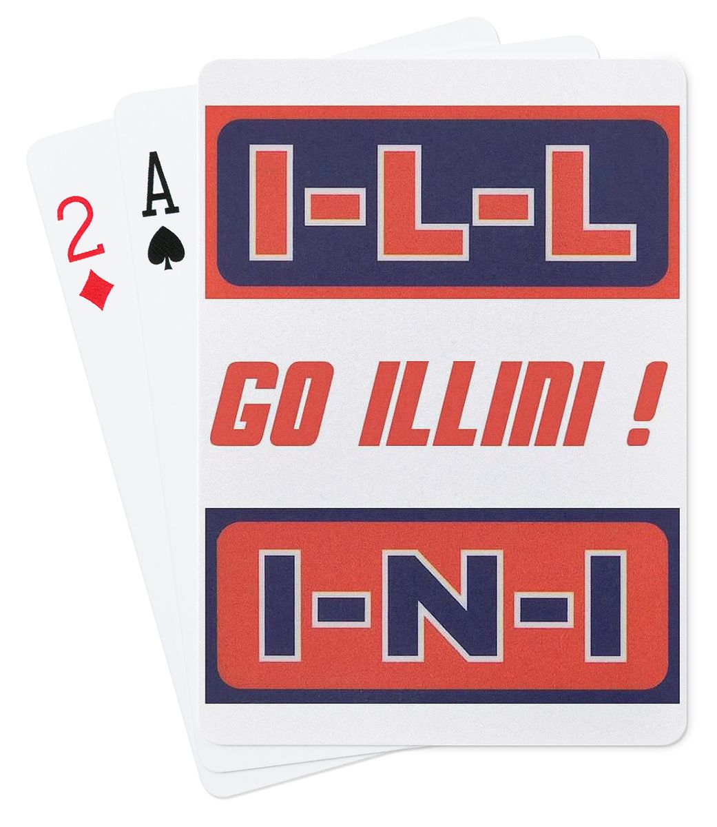 This unique deck of cards, featuring the color image of I•L•L - I•N•I Go Illini!, includes 52 standard cards and two Jokers and comes with a protective case.
