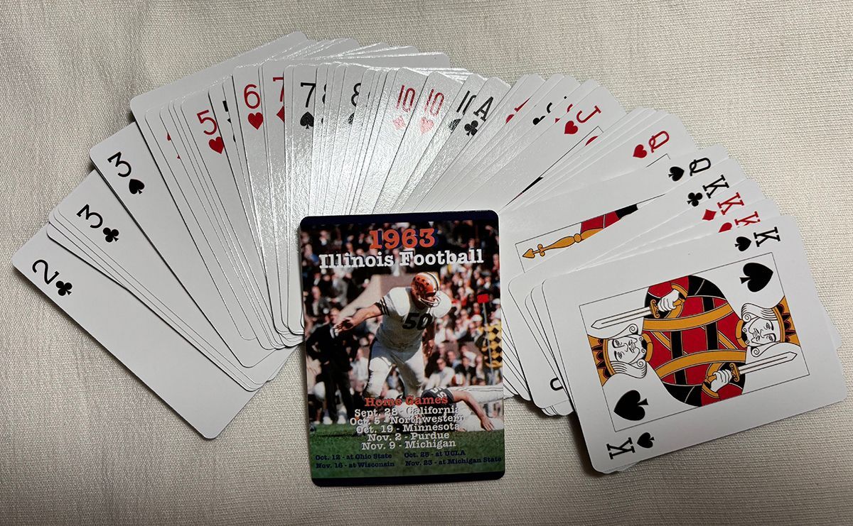 This unique deck of cards, featuring the 1963 Illini football poster (Dick Butkus), includes 52 standard cards and two Jokers and comes with a protective case.