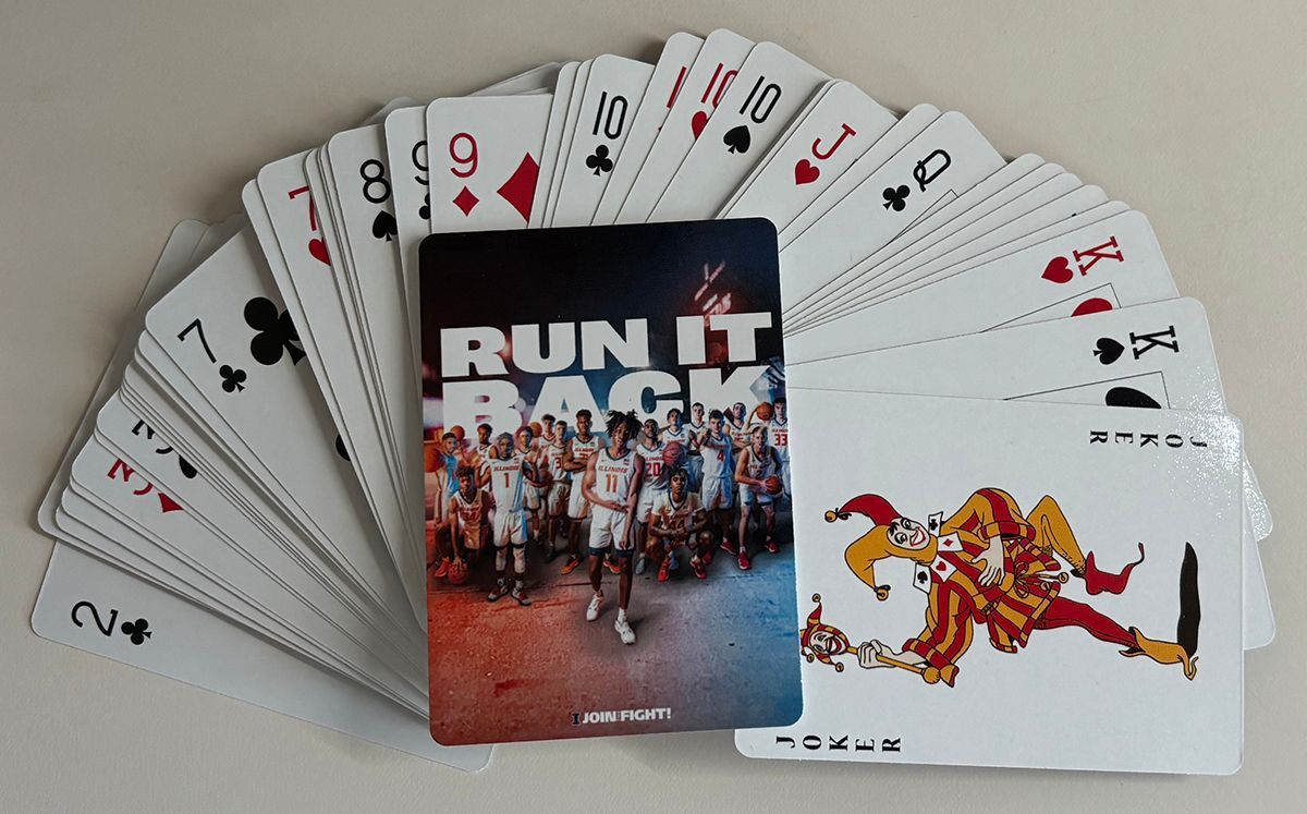 This unique deck of cards, featuring the 2020-21 Illini basketball poster image (with Ayo Dosunmu), includes 52 standard cards and two Jokers and comes with a protective case.