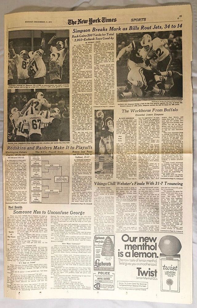 This is the Dec. 17, 1973 edition of the New York Times, covering OJ Simpson's NFL-record-breaking performance.