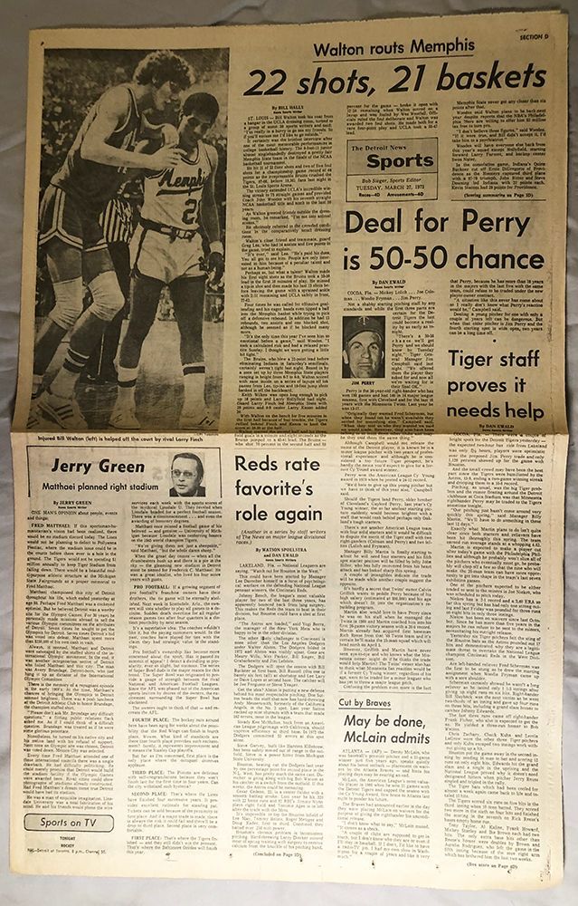 This is the Mar. 27, 1973 edition of the Detroit News, covering UCLA's NCAA championship game victory over Memphis.
