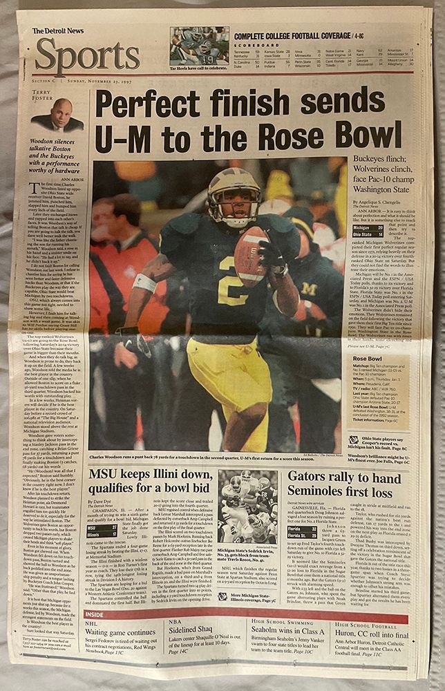 This original Nov. 23, 1997, copy of the Detroit News - documenting Michigan's win over Ohio State - is in very good condition.
