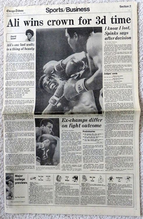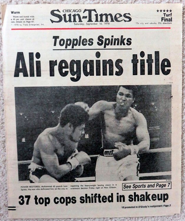 This is the September 16, 1978 edition of the Chicago Sun-Times (pages 1-2-111-112), reporting on the boxing match between Muhammad Ali and Leon Spinks.