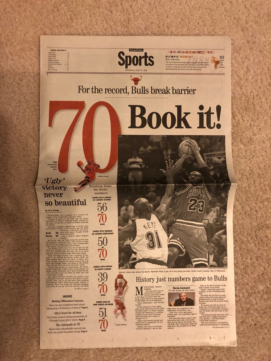 This is the Apr. 17, 1996 edition of the Chicago Tribune, covers the Chicago Bulls' historic 70th season victory (includes entire sports section).