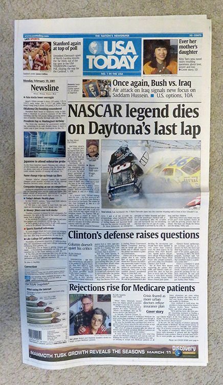 This is the Feb 19, 2001 edition of USA Today, covering Dale Earnhardt's death (includes front and sports section).