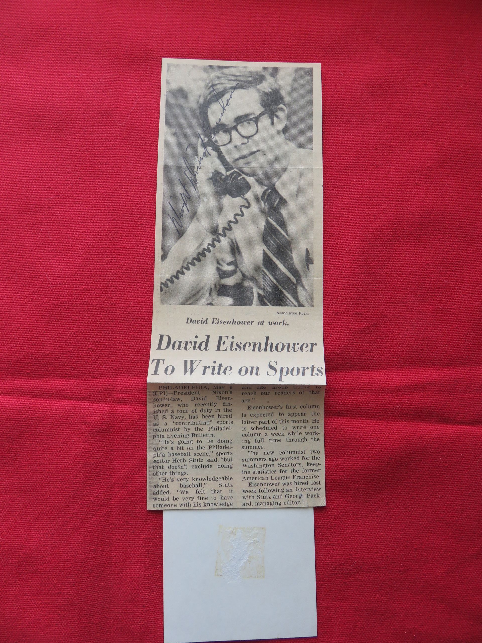 Signed "Dwight David Eisenhower" - on a 1970s clipping when he was hired as a sportswriter for the Philadelphia Evening Bulletin.