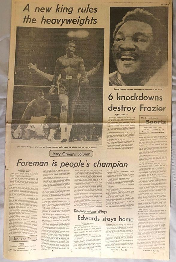 This is the Jan. 23, 1973 sports edition of the Detroit News, covering George Foreman's heavyweight victory over Joe Frazier.