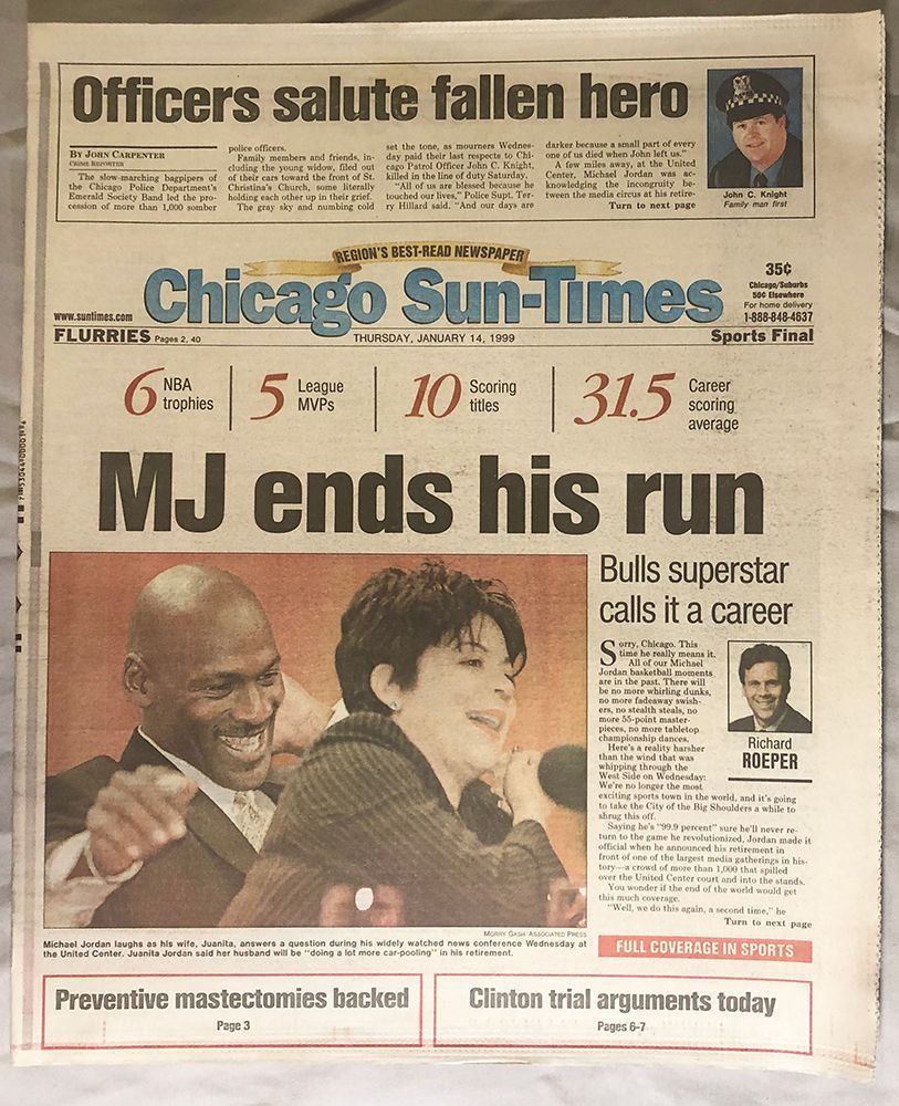 This is the Jan. 13, 1999 edition of the Chicago Sun-Times, covering the retirement of Bulls superstar Michael Jordan.