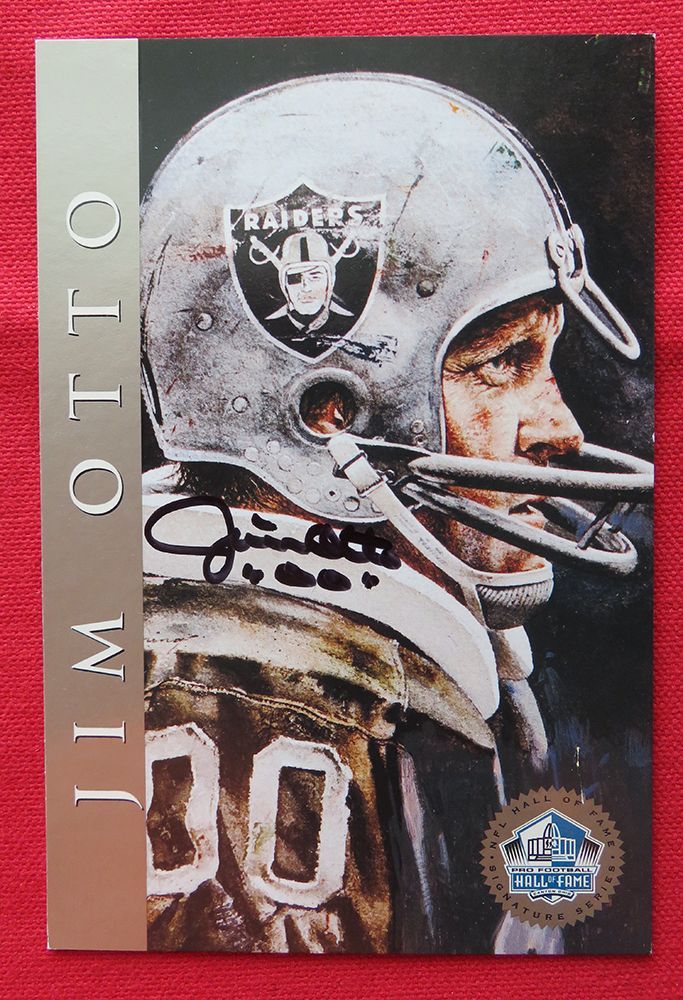Jim Otto (born Jan. 5, 1938 - died May 19, 2024) played center for 15 seasons with the Oakland Raiders. He was inducted into the Pro Football Hall of Fame in 1980, his first year of eligibility. Otto also was named to the AFL All-Time Team and the NFL 100th Anniversary All-Time Team. Measures 4" x 6".