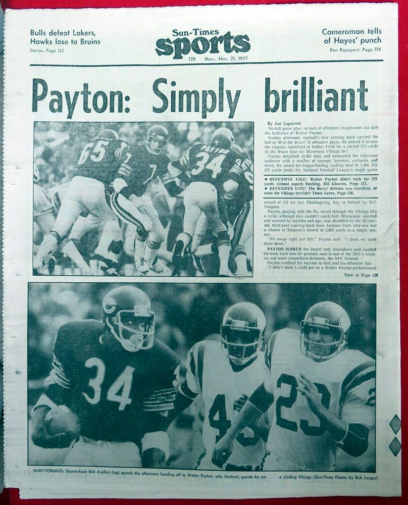 "Walter, Walter everywhere" (Payton set NFL record) - Nov. 21, 1977
