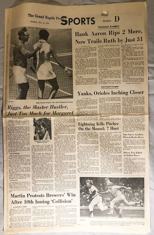 This original May 14, 1973, copy of the Grand Rapids Press - documenting the historic tennis match between Bobby Riggs and Margaret Courts - is in good condition.