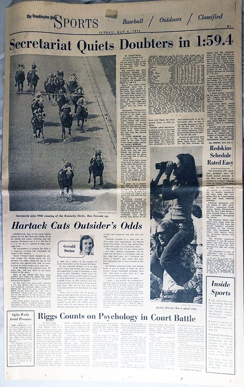 This is the May 6, 1973 edition of the Washington Post, covering Secretariat's victory in the Kentucky Derby.