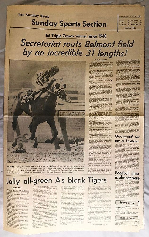 This original June 10, 1973, copy of the Detroit News - documenting Secretariat's win at the Belmont Stakes - is in very good condition.